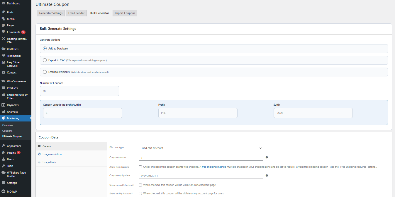 Ultimate Coupon Generator extends WooCommerce’s default coupon system with bulk generation,